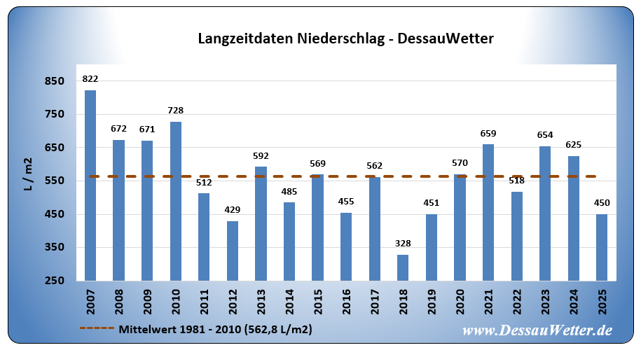 An der Wetterstation DessauWetter wurde eine mittlere Temperatur von 10,75 °C (9,6 °C) für das Jahr 2025 gemessen. Damit liegt die Temperatur um + 1,15 Kelvin höher als normal. Dies ist die höchste Jahresmitteltemperatur seit Aufzeichnungsbeginn der Wetterstation im Jahr 2006.