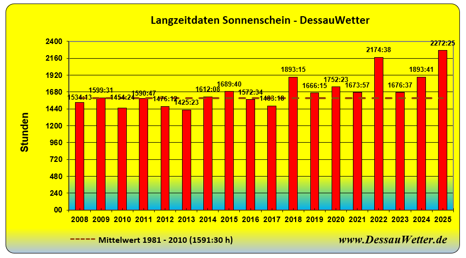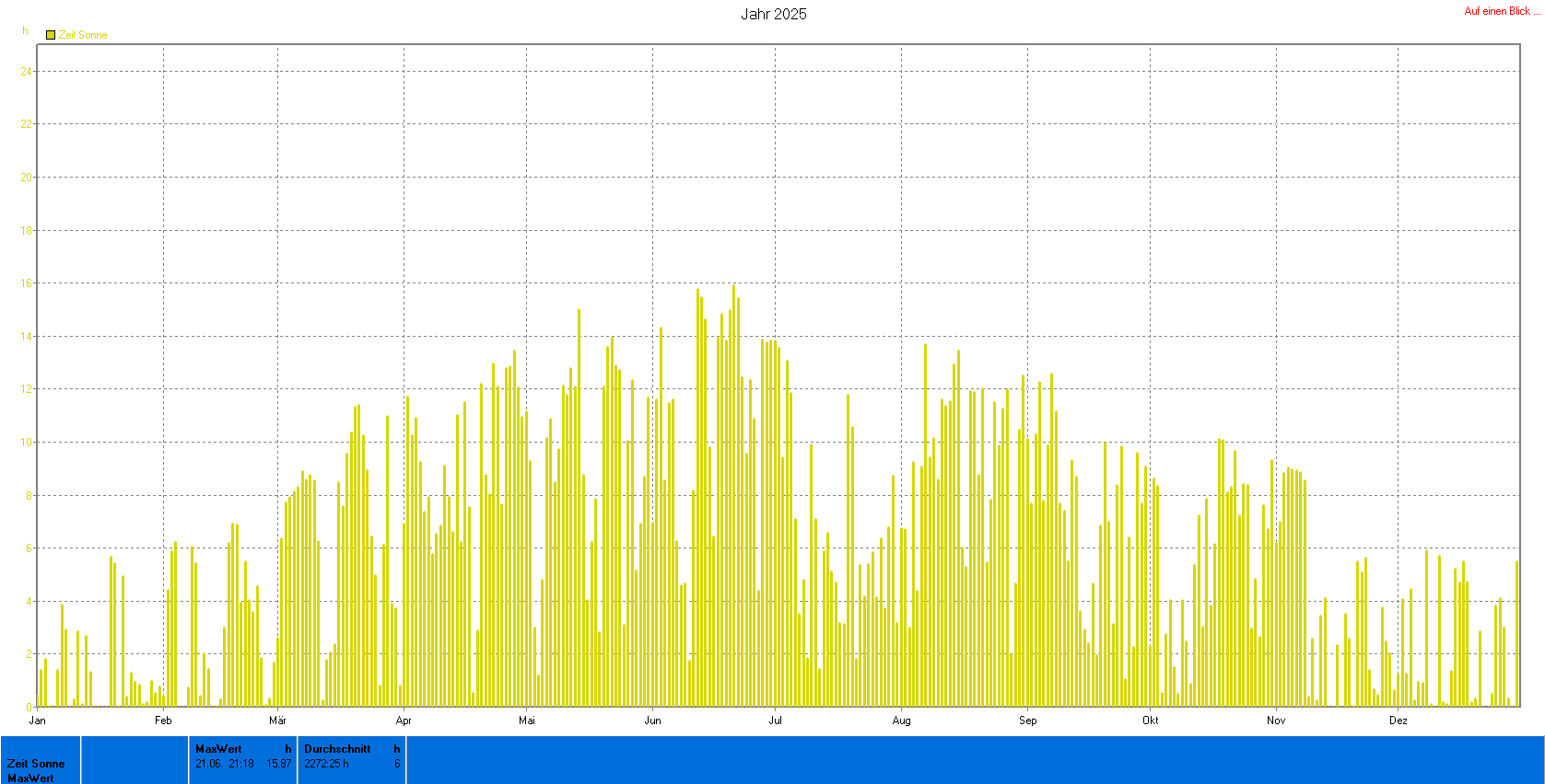 Mit einer Gesamtsonnenscheinzeit von 2272:25 Stunden wurden 142,8 % der normal am Standort zu erwartenden Zeit (1.591 h) erreicht. Hier also eine überdurchschnittliche Sonnenscheinbilanz.
